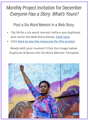 Please plan to join us on our Web Stories adventure with Six Word Memoirs on Wednesday evening December 9th at 9E/8C/7M/6P at https://teacherstechingteachers.org.