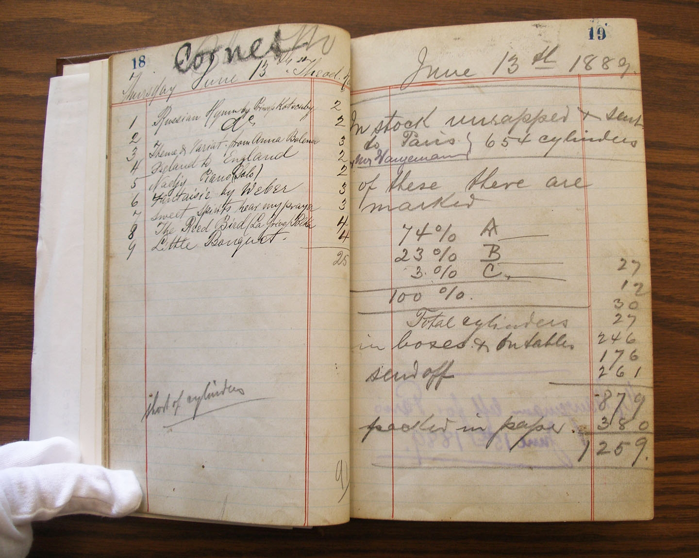 Pages 18-19 of Edison Laboratory recording session log, showing June 13, 1889 note about 654 wax cylinder blanks sent to Paris, France for Theo Wangemann.